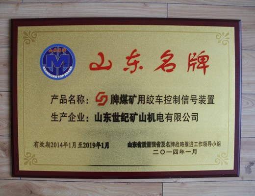山东名牌产品证书-绞车控制信号装置